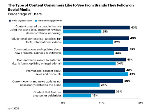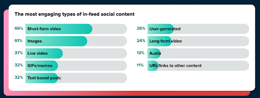 As you can see from this image, short-form videos, images, and live videos are the most engaging social media content, as per a 2022 survey.