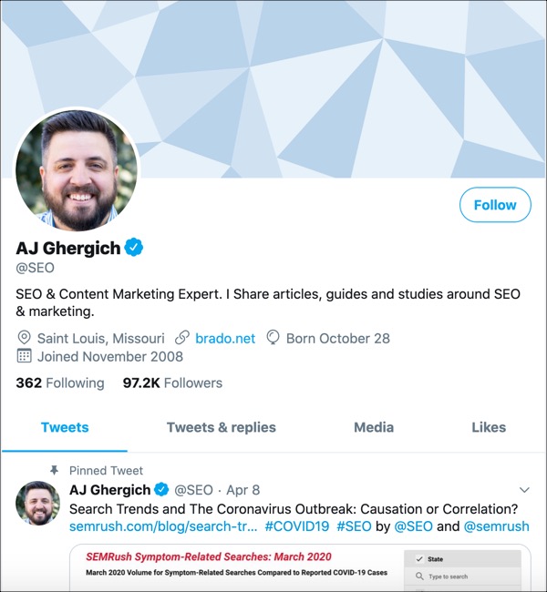 AJ Ghergich is an SEO and content marketing expert with lots of stories and guides for his followers to consume. He exclusively shares content marketing and SEO content, so his posts are extremely focused and hyper-tactical. He posts things that he creates himself, but he also shares the best content marketing news, tips, and guides available on Twitter. If you’re a content marketer, you’ve got to check out AJ Ghergich.