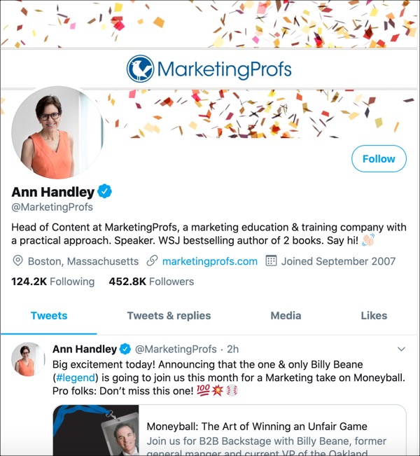 As the Head of Content at MarketingProfs and a Wall Street Journal bestselling author, Ann Handley is constantly called upon to share her expertise in the marketing world. And she does this through her Twitter. Not only does she post podcasts and articles of her own, but she often links to other great content that other marketers post.
