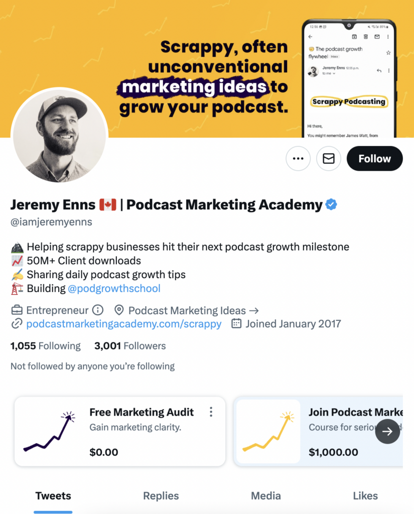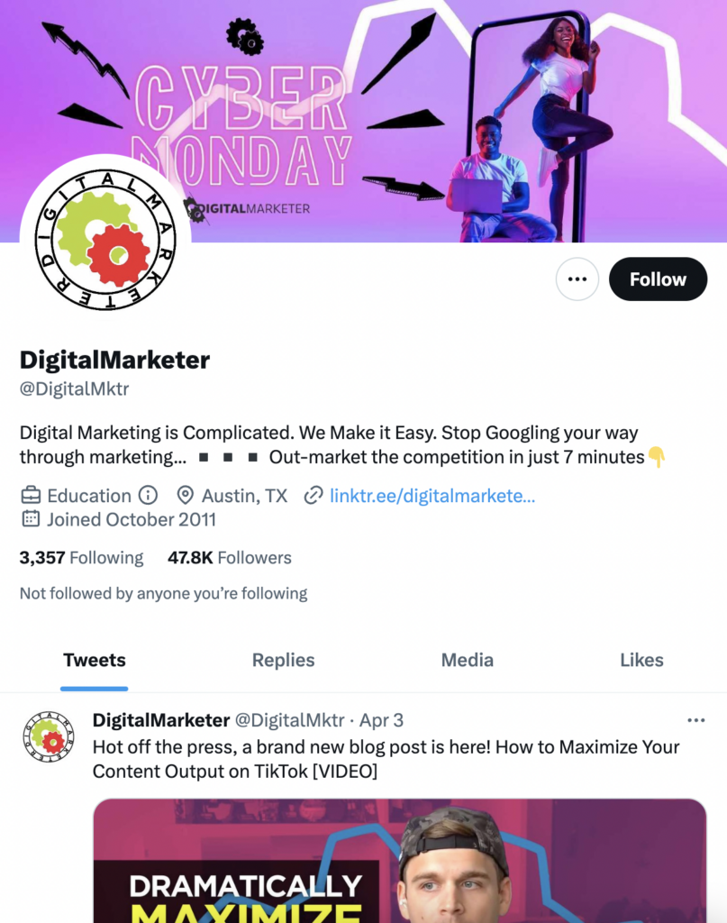 Baer primarily uses his Twitter page as a place to link to all of his live recordings, audio clips, and podcasts. He covers everything from B2B marketing tactics to LinkedIn advertising, and he’s a great follow for people who are interested in how to become better marketers.